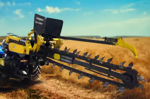 It is a new style of trenching/ digging equipment. The chain trencher adopts the rear furrow opener. Autocracy Machinery chain trencher has a compact and simple structure, small size, easy to operate, high efficiency, best quality, long life, easy maintenance, and making a neat and straight deep trench.