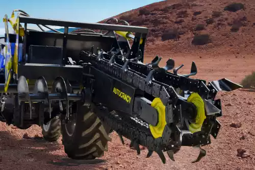 The Autocracy Machinery ditcher is composed of a toothed metal wheel. It is cheaper to operate and maintain. It can work in hard or soft soils, either homogeneous (compact rocks, silts, sands) or heterogeneous (split or broken rock, alluvia, moraines). Due to its design the wheel may reach variable cutting depths with the same tool, and can keep a constant soil working angle with a relatively small wheel diameter (which reduces the weight and therefore the pressure to the ground, and the height of the unit for transport). The teeth can be easily changed manually, and adjusted to allow different cutting widths on the same wheel. The teeth are placed in a semi-spherical configuration to increase the removal of the materials from the trench.